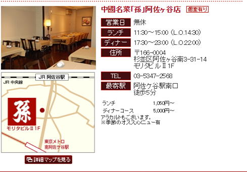 日程: 4月3日(金曜日) 3/25現在18名参加予定 場所:「中国名菜 孫 阿佐ヶ谷店」 予約済み(地図は下部) JR阿佐ヶ谷駅、メトロ丸の内線南阿佐ヶ谷駅から 時間: 11時45分 上記のお店に集合 12時 会食 会費: 5000円